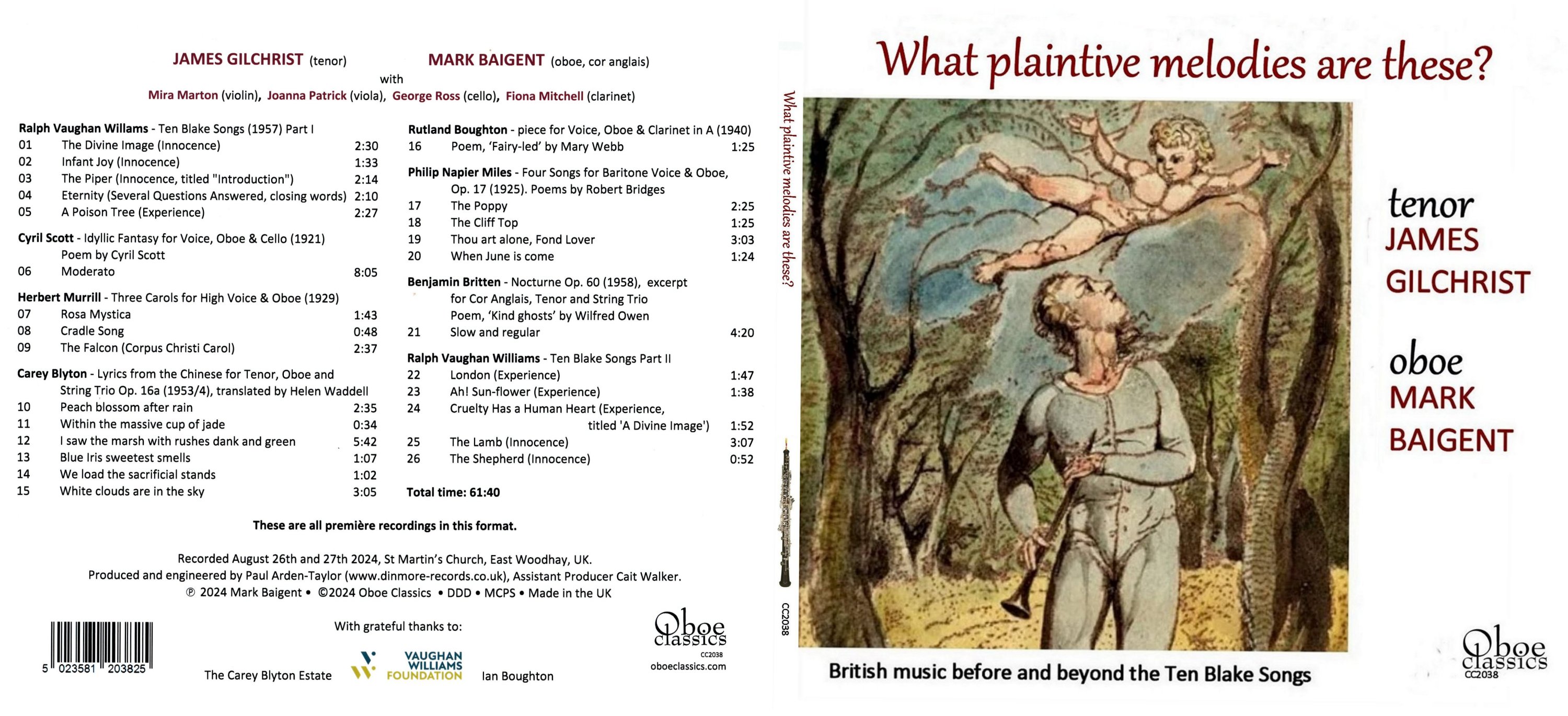 Following Mark Baigent's Rutland Boughton album (see CC2034 below), he and James Gilchrist perform the Ten Blake Songs of Ralph Vaughan Williams, with other English music for a similar combination.